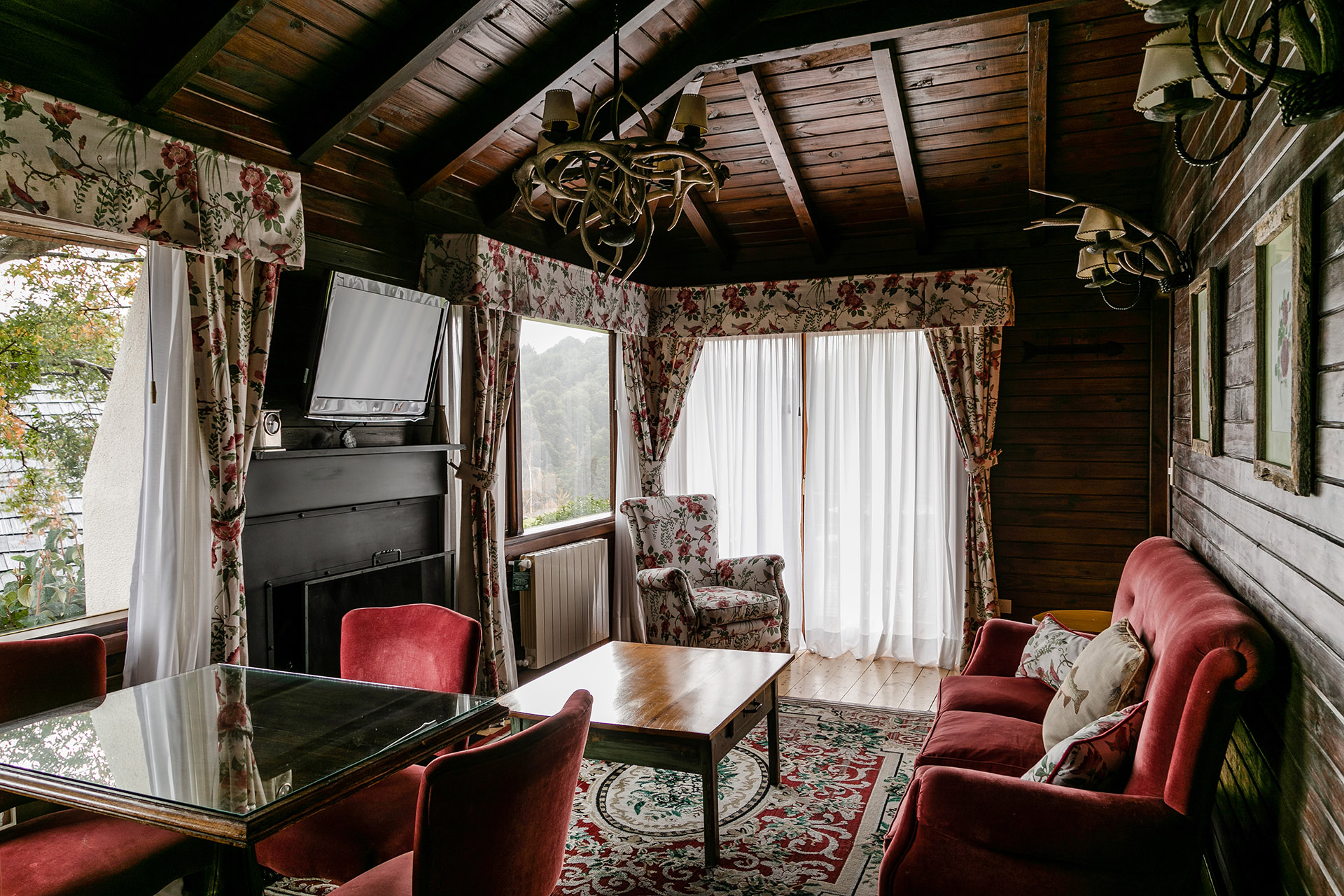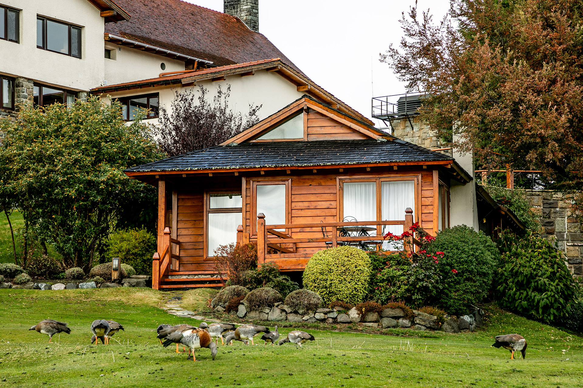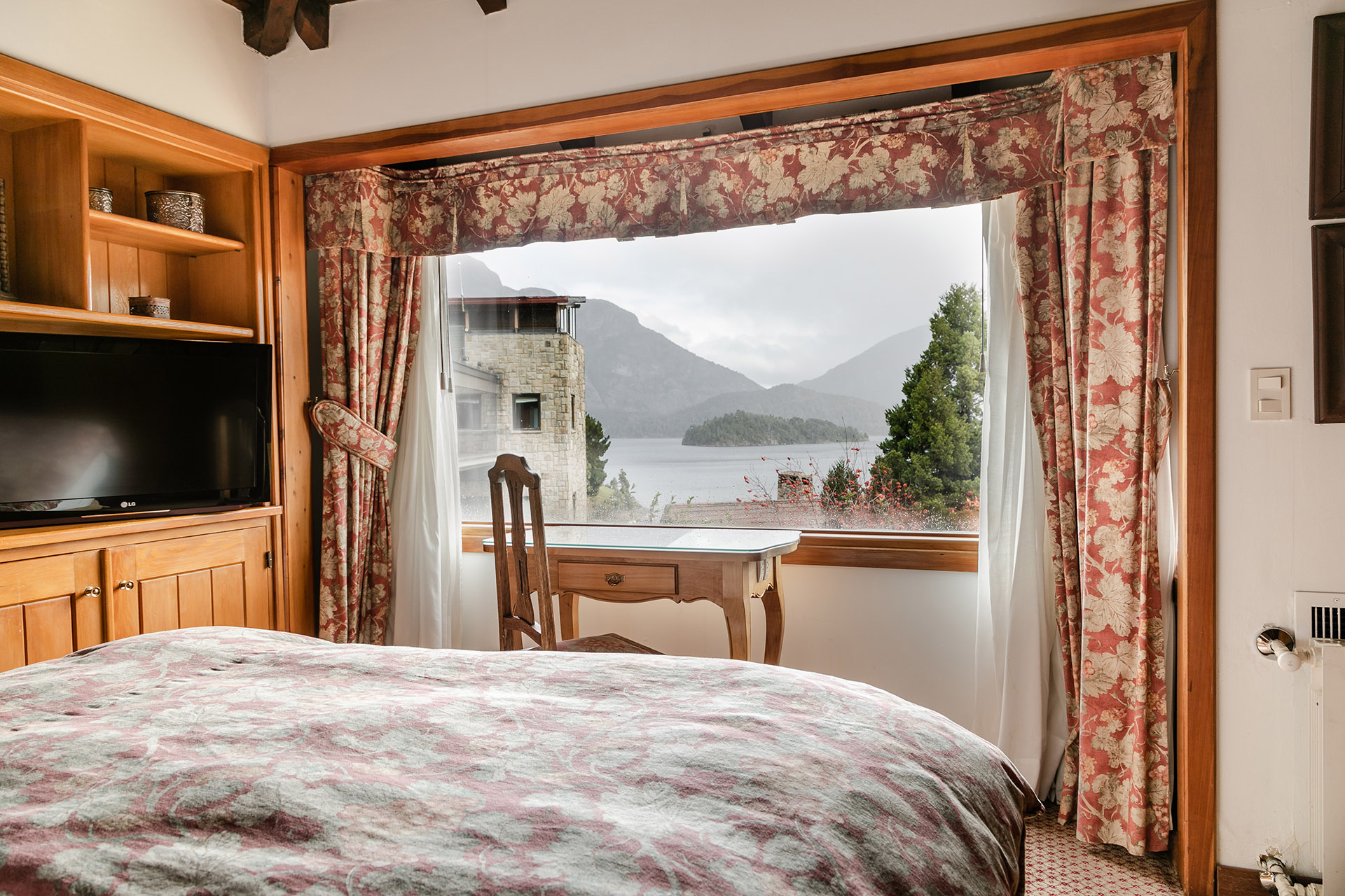 Overooking Moreno Lake and Mt. Tronador, it has two bedrooms, two bathrooms, living room with fireplace and deck. No air conditioning (approx. 570 sq. ft./ 53 m2).