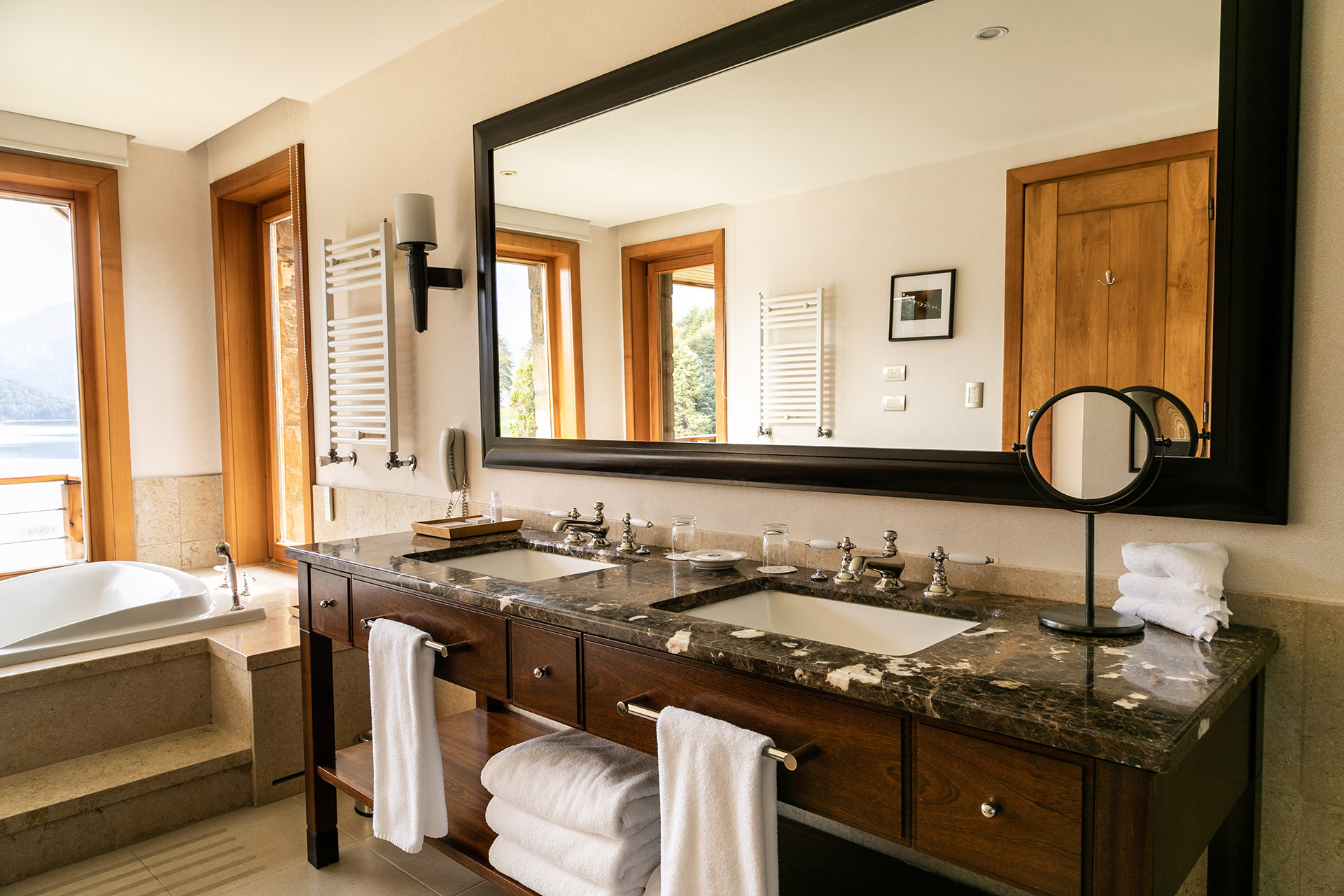 Spacious suite with amazing double jacuzzi in the bathroom, living room with large windows and imposing log fireplace, air conditioning in both rooms and terraced balcony. Our suites allows guests to appreciate the splendour of Moreno Lake and Mt. Tronador from every window (approx. 678 sq.ft. / 63 m2).